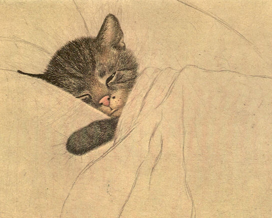 Derived from an etching by Viennese artist Guido Grünewald, the image first appeared in a black and white ad in the September 1933 issue of Fortune magazine with the slogan “Sleep Like a Kitten.”